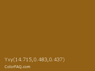 Yxy 14.715,0.483,0.437 Color is a normal orange color and the nearest color is Golden Brown #996515. Hex code #926115 and RGB value is rgb(146,97,21). In RGB color space, this color is composed of 57% red, 38% green, 8% blue, In CMYK color space, this color is composed of 0% cyan, 34% magenta, 86% yellow , 43% black , In HSL color space, this color has a hue angle of 36° , 75% saturation and 33% lightness.