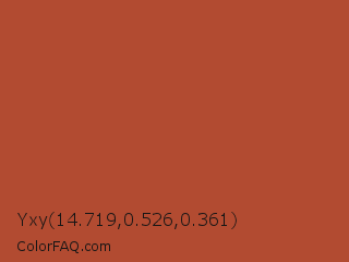 Yxy 14.719,0.526,0.361 Color is a normal red color and the nearest color is Medium Carmine #af4035. Hex code #b24b31 and RGB value is rgb(178,75,49). In RGB color space, this color is composed of 70% red, 29% green, 19% blue, In CMYK color space, this color is composed of 0% cyan, 58% magenta, 72% yellow , 30% black , In HSL color space, this color has a hue angle of 12° , 57% saturation and 45% lightness.