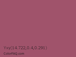 Yxy 14.722,0.4,0.291 Color is a normal rose color and the nearest color is China Rose #a8516e. Hex code #a0536b and RGB value is rgb(160,83,107). In RGB color space, this color is composed of 63% red, 33% green, 42% blue, In CMYK color space, this color is composed of 0% cyan, 48% magenta, 33% yellow , 37% black , In HSL color space, this color has a hue angle of 341° , 32% saturation and 48% lightness.