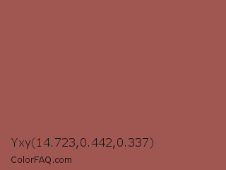 Yxy 14.723,0.442,0.337 Color is a normal red color and the nearest color is Redwood #a45a52. Hex code #a05651 and RGB value is rgb(160,86,81). In RGB color space, this color is composed of 63% red, 34% green, 32% blue, In CMYK color space, this color is composed of 0% cyan, 46% magenta, 49% yellow , 37% black , In HSL color space, this color has a hue angle of 4° , 33% saturation and 47% lightness.