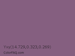 Yxy 14.729,0.323,0.269 Color is a normal magenta color and the nearest color is Chinese Violet #856088. Hex code #855f80 and RGB value is rgb(133,95,128). In RGB color space, this color is composed of 52% red, 37% green, 50% blue, In CMYK color space, this color is composed of 0% cyan, 29% magenta, 4% yellow , 48% black , In HSL color space, this color has a hue angle of 308° , 17% saturation and 45% lightness.