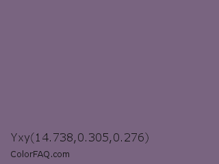 Yxy 14.738,0.305,0.276 Color is a normal purple color and the nearest color is Old Lavender #796878. Hex code #796480 and RGB value is rgb(121,100,128). In RGB color space, this color is composed of 47% red, 39% green, 50% blue, In CMYK color space, this color is composed of 5% cyan, 22% magenta, 0% yellow , 50% black , In HSL color space, this color has a hue angle of 285° , 12% saturation and 45% lightness.