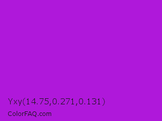 Yxy 14.75,0.271,0.131 Color is a normal purple color and the nearest color is Vivid Mulberry #b80ce3. Hex code #af18da and RGB value is rgb(175,24,218). In RGB color space, this color is composed of 69% red, 9% green, 85% blue, In CMYK color space, this color is composed of 20% cyan, 89% magenta, 0% yellow , 15% black , In HSL color space, this color has a hue angle of 287° , 80% saturation and 47% lightness.