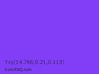Yxy 14.766,0.21,0.113 Color is a normal violet color and the nearest color is Blue Violet #8a2be2. Hex code #813ef6 and RGB value is rgb(129,62,246). In RGB color space, this color is composed of 51% red, 24% green, 96% blue, In CMYK color space, this color is composed of 48% cyan, 75% magenta, 0% yellow , 4% black , In HSL color space, this color has a hue angle of 262° , 91% saturation and 60% lightness.