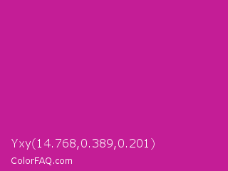 Yxy 14.768,0.389,0.201 Color is a normal magenta color and the nearest color is Royal Fuchsia #ca2c92. Hex code #c41d96 and RGB value is rgb(196,29,150). In RGB color space, this color is composed of 77% red, 11% green, 59% blue, In CMYK color space, this color is composed of 0% cyan, 85% magenta, 23% yellow , 23% black , In HSL color space, this color has a hue angle of 317° , 74% saturation and 44% lightness.