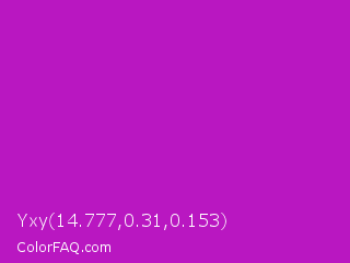 Yxy 14.777,0.31,0.153 Color is a normal magenta color and the nearest color is Heliotrope Magenta #aa00bb. Hex code #b917c1 and RGB value is rgb(185,23,193). In RGB color space, this color is composed of 73% red, 9% green, 76% blue, In CMYK color space, this color is composed of 4% cyan, 88% magenta, 0% yellow , 24% black , In HSL color space, this color has a hue angle of 297° , 79% saturation and 42% lightness.