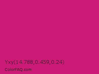Yxy 14.788,0.459,0.24 Color is a normal rose color and the nearest color is Magenta Dye #ca1f7b. Hex code #cb1b76 and RGB value is rgb(203,27,118). In RGB color space, this color is composed of 80% red, 11% green, 46% blue, In CMYK color space, this color is composed of 0% cyan, 87% magenta, 42% yellow , 20% black , In HSL color space, this color has a hue angle of 329° , 77% saturation and 45% lightness.