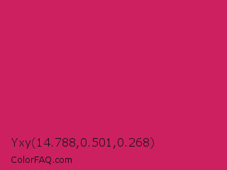 Yxy 14.788,0.501,0.268 Color is a normal rose color and the nearest color is Rose Red #c21e56. Hex code #cc2061 and RGB value is rgb(204,32,97). In RGB color space, this color is composed of 80% red, 13% green, 38% blue, In CMYK color space, this color is composed of 0% cyan, 84% magenta, 52% yellow , 20% black , In HSL color space, this color has a hue angle of 337° , 73% saturation and 46% lightness.