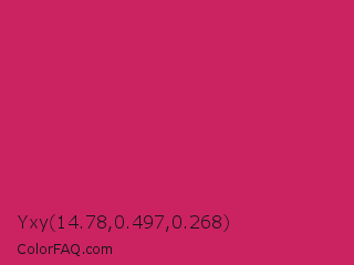 Yxy 14.78,0.497,0.268 Color is a normal rose color and the nearest color is Rose Red #c21e56. Hex code #cb2362 and RGB value is rgb(203,35,98). In RGB color space, this color is composed of 80% red, 14% green, 38% blue, In CMYK color space, this color is composed of 0% cyan, 83% magenta, 52% yellow , 20% black , In HSL color space, this color has a hue angle of 338° , 71% saturation and 47% lightness.