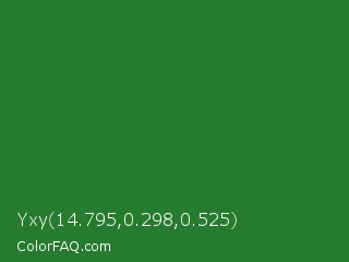 Yxy 14.795,0.298,0.525 Color is a normal green color and the nearest color is Forest Green #228b22. Hex code #277b2e and RGB value is rgb(39,123,46). In RGB color space, this color is composed of 15% red, 48% green, 18% blue, In CMYK color space, this color is composed of 68% cyan, 0% magenta, 63% yellow , 52% black , In HSL color space, this color has a hue angle of 125° , 52% saturation and 32% lightness.