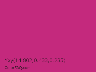 Yxy 14.802,0.433,0.235 Color is a normal magenta color and the nearest color is Magenta Dye #ca1f7b. Hex code #c4297d and RGB value is rgb(196,41,125). In RGB color space, this color is composed of 77% red, 16% green, 49% blue, In CMYK color space, this color is composed of 0% cyan, 79% magenta, 36% yellow , 23% black , In HSL color space, this color has a hue angle of 327° , 65% saturation and 46% lightness.