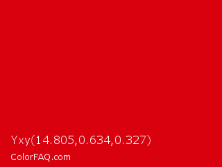 Yxy 14.805,0.634,0.327 Color is a normal red color and the nearest color is Rosso Corsa #d40000. Hex code #d9010e and RGB value is rgb(217,1,14). In RGB color space, this color is composed of 85% red, 0% green, 5% blue, In CMYK color space, this color is composed of 0% cyan, 100% magenta, 94% yellow , 15% black , In HSL color space, this color has a hue angle of 356° , 99% saturation and 43% lightness.