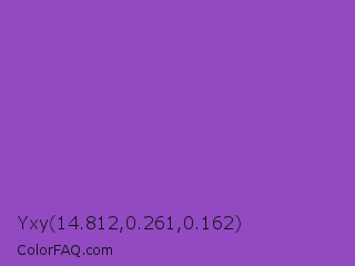Yxy 14.812,0.261,0.162 Color is a normal purple color and the nearest color is Deep Lilac #9955bb. Hex code #914ac2 and RGB value is rgb(145,74,194). In RGB color space, this color is composed of 57% red, 29% green, 76% blue, In CMYK color space, this color is composed of 25% cyan, 62% magenta, 0% yellow , 24% black , In HSL color space, this color has a hue angle of 276° , 50% saturation and 53% lightness.