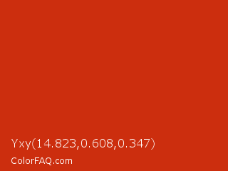 Yxy 14.823,0.608,0.347 Color is a normal red color and the nearest color is Thunderbird #c02b18. Hex code #cc2e0e and RGB value is rgb(204,46,14). In RGB color space, this color is composed of 80% red, 18% green, 5% blue, In CMYK color space, this color is composed of 0% cyan, 77% magenta, 93% yellow , 20% black , In HSL color space, this color has a hue angle of 10° , 87% saturation and 43% lightness.