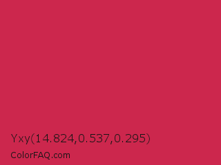 Yxy 14.824,0.537,0.295 Color is a normal red color and the nearest color is French Raspberry #c72c48. Hex code #cc274d and RGB value is rgb(204,39,77). In RGB color space, this color is composed of 80% red, 15% green, 30% blue, In CMYK color space, this color is composed of 0% cyan, 81% magenta, 62% yellow , 20% black , In HSL color space, this color has a hue angle of 346° , 68% saturation and 48% lightness.