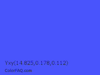 Yxy 14.825,0.178,0.112 Color is a light blue color and the nearest color is Ultramarine Blue #4166f5. Hex code #4954fc and RGB value is rgb(73,84,252). In RGB color space, this color is composed of 29% red, 33% green, 99% blue, In CMYK color space, this color is composed of 71% cyan, 67% magenta, 0% yellow , 1% black , In HSL color space, this color has a hue angle of 236° , 97% saturation and 64% lightness.