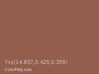 Yxy 14.837,0.425,0.359 Color is a normal red color and the nearest color is Spicy Mix #8b5f4d. Hex code #945e4d and RGB value is rgb(148,94,77). In RGB color space, this color is composed of 58% red, 37% green, 30% blue, In CMYK color space, this color is composed of 0% cyan, 36% magenta, 48% yellow , 42% black , In HSL color space, this color has a hue angle of 14° , 32% saturation and 44% lightness.