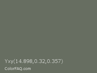 Yxy 14.898,0.32,0.357 Color is a normal green color and the nearest color is Willow Grove #65745d. Hex code #676e61 and RGB value is rgb(103,110,97). In RGB color space, this color is composed of 40% red, 43% green, 38% blue, In CMYK color space, this color is composed of 6% cyan, 0% magenta, 12% yellow , 57% black , In HSL color space, this color has a hue angle of 92° , 6% saturation and 41% lightness.