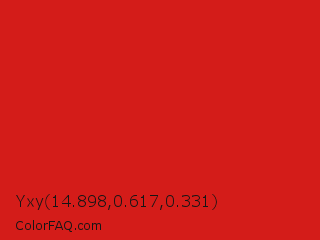 Yxy 14.898,0.617,0.331 Color is a normal red color and the nearest color is Maximum Red #d92121. Hex code #d41c19 and RGB value is rgb(212,28,25). In RGB color space, this color is composed of 83% red, 11% green, 10% blue, In CMYK color space, this color is composed of 0% cyan, 87% magenta, 88% yellow , 17% black , In HSL color space, this color has a hue angle of 1° , 79% saturation and 46% lightness.
