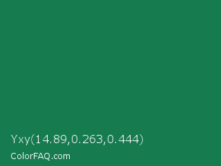 Yxy 14.89,0.263,0.444 Color is a dark green color and the nearest color is Dark Spring Green #177245. Hex code #167b4f and RGB value is rgb(22,123,79). In RGB color space, this color is composed of 9% red, 48% green, 31% blue, In CMYK color space, this color is composed of 82% cyan, 0% magenta, 36% yellow , 52% black , In HSL color space, this color has a hue angle of 154° , 70% saturation and 28% lightness.