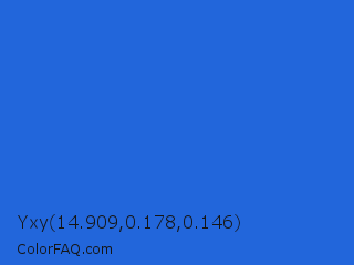 Yxy 14.909,0.178,0.146 Color is a normal blue color and the nearest color is Mariner #286acd. Hex code #2266db and RGB value is rgb(34,102,219). In RGB color space, this color is composed of 13% red, 40% green, 86% blue, In CMYK color space, this color is composed of 84% cyan, 53% magenta, 0% yellow , 14% black , In HSL color space, this color has a hue angle of 218° , 73% saturation and 50% lightness.