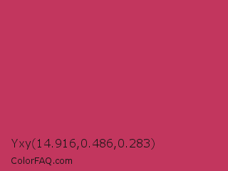 Yxy 14.916,0.486,0.283 Color is a normal rose color and the nearest color is Dingy Dungeon #c53151. Hex code #c2365e and RGB value is rgb(194,54,94). In RGB color space, this color is composed of 76% red, 21% green, 37% blue, In CMYK color space, this color is composed of 0% cyan, 72% magenta, 52% yellow , 24% black , In HSL color space, this color has a hue angle of 343° , 56% saturation and 49% lightness.