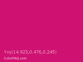 Yxy 14.923,0.476,0.245 Color is a normal rose color and the nearest color is Dogwood Rose #d71868. Hex code #cf1271 and RGB value is rgb(207,18,113). In RGB color space, this color is composed of 81% red, 7% green, 44% blue, In CMYK color space, this color is composed of 0% cyan, 91% magenta, 45% yellow , 19% black , In HSL color space, this color has a hue angle of 330° , 84% saturation and 44% lightness.