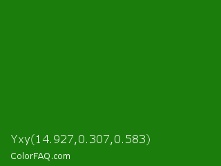 Yxy 14.927,0.307,0.583 Color is a dark green color and the nearest color is India Green #138808. Hex code #1b7d0c and RGB value is rgb(27,125,12). In RGB color space, this color is composed of 11% red, 49% green, 5% blue, In CMYK color space, this color is composed of 78% cyan, 0% magenta, 90% yellow , 51% black , In HSL color space, this color has a hue angle of 112° , 82% saturation and 27% lightness.