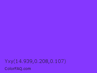 Yxy 14.939,0.208,0.107 Color is a light violet color and the nearest color is Blue Violet #8a2be2. Hex code #8537ff and RGB value is rgb(133,55,255). In RGB color space, this color is composed of 52% red, 22% green, 100% blue, In CMYK color space, this color is composed of 48% cyan, 78% magenta, 0% yellow , 0% black , In HSL color space, this color has a hue angle of 263° , 100% saturation and 61% lightness.