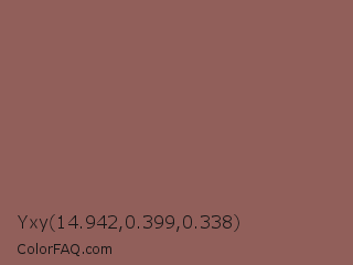 Yxy 14.942,0.399,0.338 Color is a normal red color and the nearest color is Rose Taupe #905d5d. Hex code #915f5a and RGB value is rgb(145,95,90). In RGB color space, this color is composed of 57% red, 37% green, 35% blue, In CMYK color space, this color is composed of 0% cyan, 34% magenta, 38% yellow , 43% black , In HSL color space, this color has a hue angle of 5° , 23% saturation and 46% lightness.
