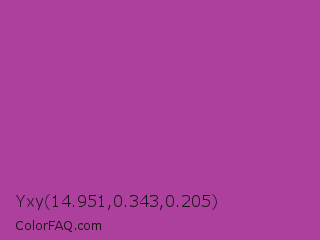Yxy 14.951,0.343,0.205 Color is a normal magenta color and the nearest color is Byzantine #bd33a4. Hex code #ad409c and RGB value is rgb(173,64,156). In RGB color space, this color is composed of 68% red, 25% green, 61% blue, In CMYK color space, this color is composed of 0% cyan, 63% magenta, 10% yellow , 32% black , In HSL color space, this color has a hue angle of 309° , 46% saturation and 46% lightness.