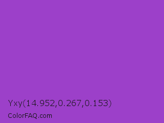 Yxy 14.952,0.267,0.153 Color is a normal purple color and the nearest color is Dark Orchid #9932cc. Hex code #9c40c9 and RGB value is rgb(156,64,201). In RGB color space, this color is composed of 61% red, 25% green, 79% blue, In CMYK color space, this color is composed of 22% cyan, 68% magenta, 0% yellow , 21% black , In HSL color space, this color has a hue angle of 280° , 56% saturation and 52% lightness.