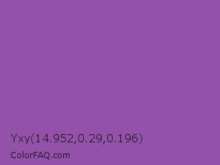 Yxy 14.952,0.29,0.196 Color is a normal purple color and the nearest color is Purpureus #9a4eae. Hex code #9351a9 and RGB value is rgb(147,81,169). In RGB color space, this color is composed of 58% red, 32% green, 66% blue, In CMYK color space, this color is composed of 13% cyan, 52% magenta, 0% yellow , 34% black , In HSL color space, this color has a hue angle of 285° , 35% saturation and 49% lightness.