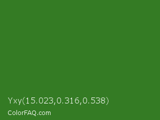 Yxy 15.023,0.316,0.538 Color is a normal green color and the nearest color is Bilbao #327c14. Hex code #347b24 and RGB value is rgb(52,123,36). In RGB color space, this color is composed of 20% red, 48% green, 14% blue, In CMYK color space, this color is composed of 58% cyan, 0% magenta, 71% yellow , 52% black , In HSL color space, this color has a hue angle of 109° , 55% saturation and 31% lightness.