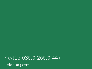 Yxy 15.036,0.266,0.44 Color is a dark green color and the nearest color is Dark Spring Green #177245. Hex code #1f7b50 and RGB value is rgb(31,123,80). In RGB color space, this color is composed of 12% red, 48% green, 31% blue, In CMYK color space, this color is composed of 75% cyan, 0% magenta, 35% yellow , 52% black , In HSL color space, this color has a hue angle of 152° , 60% saturation and 30% lightness.