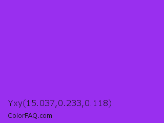 Yxy 15.037,0.233,0.118 Color is a normal purple color and the nearest color is Veronica #a020f0. Hex code #992fef and RGB value is rgb(153,47,239). In RGB color space, this color is composed of 60% red, 18% green, 94% blue, In CMYK color space, this color is composed of 36% cyan, 80% magenta, 0% yellow , 6% black , In HSL color space, this color has a hue angle of 273° , 86% saturation and 56% lightness.