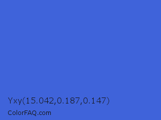 Yxy 15.042,0.187,0.147 Color is a normal blue color and the nearest color is Royal Blue #4169e1. Hex code #3f63da and RGB value is rgb(63,99,218). In RGB color space, this color is composed of 25% red, 39% green, 85% blue, In CMYK color space, this color is composed of 71% cyan, 55% magenta, 0% yellow , 15% black , In HSL color space, this color has a hue angle of 226° , 68% saturation and 55% lightness.