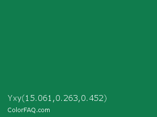 Yxy 15.061,0.263,0.452 Color is a dark green color and the nearest color is Salem #097f4b. Hex code #107c4d and RGB value is rgb(16,124,77). In RGB color space, this color is composed of 6% red, 49% green, 30% blue, In CMYK color space, this color is composed of 87% cyan, 0% magenta, 38% yellow , 51% black , In HSL color space, this color has a hue angle of 154° , 77% saturation and 27% lightness.