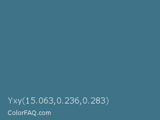 Yxy 15.063,0.236,0.283 Color is a normal blue color and the nearest color is Teal Blue #367588. Hex code #3e7388 and RGB value is rgb(62,115,136). In RGB color space, this color is composed of 24% red, 45% green, 53% blue, In CMYK color space, this color is composed of 54% cyan, 15% magenta, 0% yellow , 47% black , In HSL color space, this color has a hue angle of 197° , 37% saturation and 39% lightness.