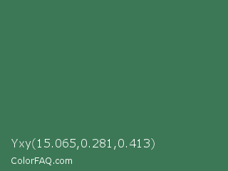 Yxy 15.065,0.281,0.413 Color is a normal green color and the nearest color is Amazon #3b7a57. Hex code #3c7856 and RGB value is rgb(60,120,86). In RGB color space, this color is composed of 24% red, 47% green, 34% blue, In CMYK color space, this color is composed of 50% cyan, 0% magenta, 28% yellow , 53% black , In HSL color space, this color has a hue angle of 146° , 33% saturation and 35% lightness.