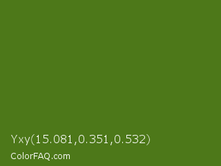 Yxy 15.081,0.351,0.532 Color is a dark green color and the nearest color is Sap Green #507d2a. Hex code #4d7819 and RGB value is rgb(77,120,25). In RGB color space, this color is composed of 30% red, 47% green, 10% blue, In CMYK color space, this color is composed of 36% cyan, 0% magenta, 79% yellow , 53% black , In HSL color space, this color has a hue angle of 87° , 66% saturation and 28% lightness.