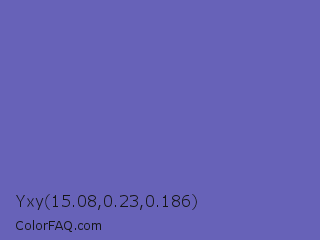 Yxy 15.08,0.23,0.186 Color is a normal indigo color and the nearest color is Blue Violet #6456b7. Hex code #6762b8 and RGB value is rgb(103,98,184). In RGB color space, this color is composed of 40% red, 38% green, 72% blue, In CMYK color space, this color is composed of 44% cyan, 47% magenta, 0% yellow , 28% black , In HSL color space, this color has a hue angle of 243° , 38% saturation and 55% lightness.