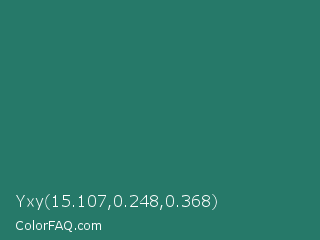 Yxy 15.107,0.248,0.368 Color is a normal cyan color and the nearest color is Myrtle Green #317873. Hex code #267969 and RGB value is rgb(38,121,105). In RGB color space, this color is composed of 15% red, 47% green, 41% blue, In CMYK color space, this color is composed of 69% cyan, 0% magenta, 13% yellow , 53% black , In HSL color space, this color has a hue angle of 168° , 52% saturation and 31% lightness.