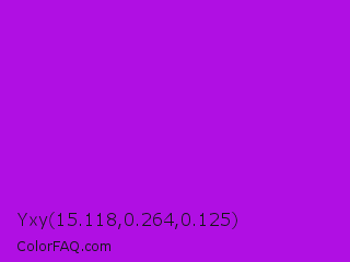 Yxy 15.118,0.264,0.125 Color is a normal purple color and the nearest color is Vivid Mulberry #b80ce3. Hex code #b00fe3 and RGB value is rgb(176,15,227). In RGB color space, this color is composed of 69% red, 6% green, 89% blue, In CMYK color space, this color is composed of 22% cyan, 93% magenta, 0% yellow , 11% black , In HSL color space, this color has a hue angle of 286° , 88% saturation and 47% lightness.