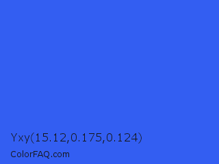 Yxy 15.12,0.175,0.124 Color is a normal blue color and the nearest color is Ultramarine Blue #4166f5. Hex code #335ef2 and RGB value is rgb(51,94,242). In RGB color space, this color is composed of 20% red, 37% green, 95% blue, In CMYK color space, this color is composed of 79% cyan, 61% magenta, 0% yellow , 5% black , In HSL color space, this color has a hue angle of 226° , 88% saturation and 57% lightness.