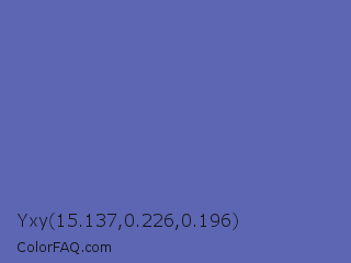 Yxy 15.137,0.226,0.196 Color is a normal blue color and the nearest color is Scampi #675fa6. Hex code #5d66b3 and RGB value is rgb(93,102,179). In RGB color space, this color is composed of 36% red, 40% green, 70% blue, In CMYK color space, this color is composed of 48% cyan, 43% magenta, 0% yellow , 30% black , In HSL color space, this color has a hue angle of 234° , 36% saturation and 53% lightness.