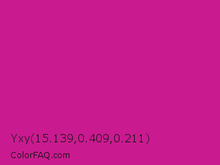 Yxy 15.139,0.409,0.211 Color is a normal magenta color and the nearest color is Red Violet #c71585. Hex code #c91b8f and RGB value is rgb(201,27,143). In RGB color space, this color is composed of 79% red, 11% green, 56% blue, In CMYK color space, this color is composed of 0% cyan, 87% magenta, 29% yellow , 21% black , In HSL color space, this color has a hue angle of 320° , 76% saturation and 45% lightness.