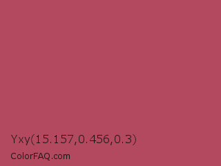 Yxy 15.157,0.456,0.3 Color is a normal red color and the nearest color is Hippie Pink #ae4560. Hex code #b3495e and RGB value is rgb(179,73,94). In RGB color space, this color is composed of 70% red, 29% green, 37% blue, In CMYK color space, this color is composed of 0% cyan, 59% magenta, 47% yellow , 30% black , In HSL color space, this color has a hue angle of 348° , 42% saturation and 49% lightness.