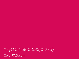 Yxy 15.158,0.536,0.275 Color is a normal rose color and the nearest color is Debian Red #d70a53. Hex code #d60857 and RGB value is rgb(214,8,87). In RGB color space, this color is composed of 84% red, 3% green, 34% blue, In CMYK color space, this color is composed of 0% cyan, 96% magenta, 59% yellow , 16% black , In HSL color space, this color has a hue angle of 337° , 93% saturation and 44% lightness.