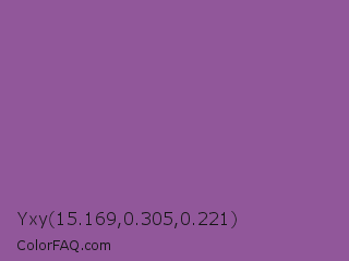 Yxy 15.169,0.305,0.221 Color is a normal magenta color and the nearest color is Trendy Pink #8c6495. Hex code #91579a and RGB value is rgb(145,87,154). In RGB color space, this color is composed of 57% red, 34% green, 60% blue, In CMYK color space, this color is composed of 6% cyan, 44% magenta, 0% yellow , 40% black , In HSL color space, this color has a hue angle of 292° , 28% saturation and 47% lightness.